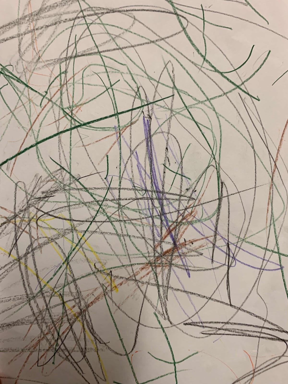 Child #2 (below) could not write his name at the beginning of the year. Teacher wrote his name of him. After working on drawing lines, shapes and exploring them with varying media, he is now able to write his name very well.